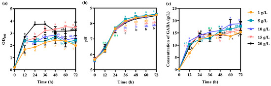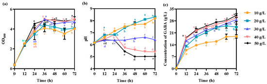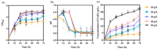 Effects of the glucose concentration on (a) cell growth, (b) pH, and (c) GABA production. The strain was grown in GYP medium containing 50 g/L monosodium glutamate and 10 g/L silkworm pupae meal with different concentrations of glucose used as carbon sources. Each experiment was biologically repeated three times. The final results are expressed as the mean and standard deviation of the three repetitions. Error bars represent the standard deviation of the mean. Values followed by different small letters at the same time indicate significant differences at p < 0.05.