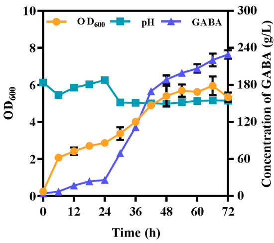 L. hilgardii GZ2 was fermented for 72 h by fed-batch fermentation for GABA production (Figure 6). GABA production occurs simultaneously with cell growth. After 24 h, by feeding glucose and monosodium glutamate, the pH decreased from 6.2 ± 0.028 to 5.0 ± 0.007 during the growth period, creating a suitable environment for GAD activity (Figure 6). The OD600 of L. hilgardii GZ2 rapidly increased with a pH controlled at 5.0 (Figure 6). Accordingly, the GABA concentration increased within 36 h and then moderately increased after 42 h (Figure 6). Finally, the GABA titer was 229.3 ± 6.846 g/L, and the productivity reached 3.2 g/L/h after 72 h of fermentation (Figure 6), which was 7.3 times higher than that of nonfed-batch fermentation.