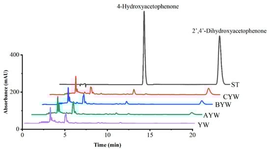 HPLC chromatogram of 4-hydroxyacetophenone and 2,4-dihydroxyacetophenone. ST, standards. YW, AYW, BYW, and CYW are the groups to which we added C. bungei Decne at 0%, 5%, 15%, and 25%, respectively.