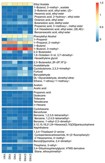 Heat maps of volatiles in CYW and YW. CYW1–CYW3 represent three repeats of the samples with 25% C. bungei Decne, and YW1–YW3 represent three repeats of the control group. The unit of the data bar is μg mL−1.
