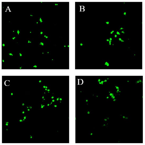 The yeast’s viability was also visually analysed through fluorescence microscopy, as described by Kwolek-Mirek et al. [], with slight modifications. Briefly, on day 7, 1.5 mL culture solutions of all the wine samples, respectively, were taken and centrifuged at 4000 rpm for 10 min at 4 °C, and the supernatant was removed. After washing twice with phosphate-buffered saline (PBS) buffer, the precipitate was subsequently mixed with 0.4 mL of normal saline. Then, 0.1 mL of the resulting solution was added into 2 mL of PBS buffer and 0.01 mL of fluorescein diacetate (FDA, 0.5 mg mL−1) and stained for 10 min in the dark. The slides were prepared and observed under an inverted fluorescence microscope with 525 nm emission and 488 nm excitation, respectively.