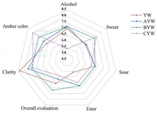 Sensory evaluation is the most intuitive expression of the consumer acceptance of foods, and it is also the key to the marketing of new alcoholic beverages. As shown in Figure 4, the highest clarity was obtained for YW, and the highest sweetness was recorded for CYW, because it contained a higher content of reducing sugar (Table 1). In terms of colour, the amber colour of the wine body was increased with the increase in C. bungei Decne. However, the lowest overall evaluation was recorded for CYW, while most of the evaluators assigned BYW relatively high balance in terms of its flavour characteristics (sweet, alcoholic, sour, and ester) and the highest overall evaluation. Overall, YW and AYW had simple tastes, obvious aromas, and clear appearances. BYW had good overall balance in terms of taste, an obvious aroma, and an excellent fragrance, which were highly favoured by consumers. On the other hand, the taste of CYW was too strong, which led to low acceptance by consumers. This was due to the fact that C. bungei Decne contains a variety of volatile compounds and has a characteristic odour [], which can negatively affect the flavour of rice wine with excessive addition. In summary, BYW was the wine sample with the best acceptability.