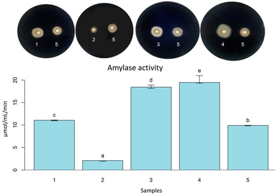 Amylase activity with Petri dishes screening of L. fermentum (S) (1); B. licheniformis LMG 12363 (P) (2); P. pentosaceus (S) (3); S. cerevisiae (S2) (4); B. subtilis LFB-FIOCRUZ 1267 (5). Different letters indicate statistically significant (p < 0.05) differences between the samples.