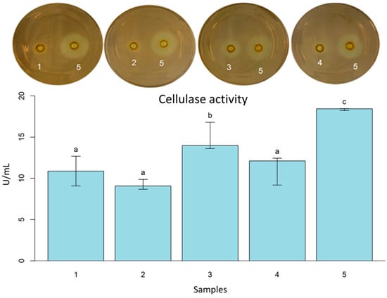 Cellulase activity with Petri dishes screening of L. fermentum (S) (1); B. licheniformis LMG 12363 (P) (2); P. pentosaceus (S) (3); S. cerevisiae (S2) (4); B. subtilis LFB-FIOCRUZ 1267(5). Different letters indicate statistically significant (p < 0.05) differences between the samples.