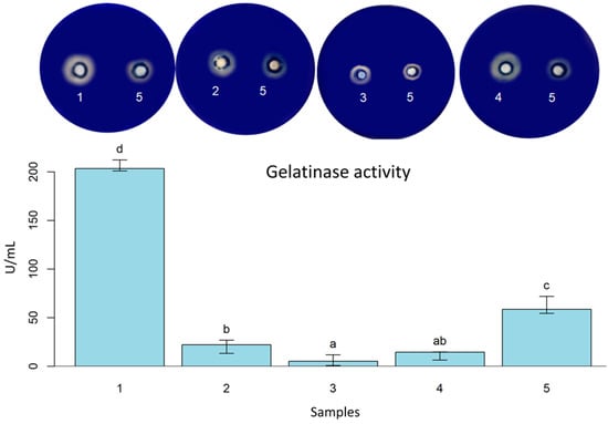 Gelatinase activity with Petri dishes screening of L. fermentum (S) (1); B. licheniformis LMG 12363 (P) (2); P. pentosaceus (S) (3); S. cerevisiae (S2) (4); B. subtilis LFB-FIOCRUZ 1267 (5). Different letters indicate statistically significant (p < 0.05) differences between the samples.
