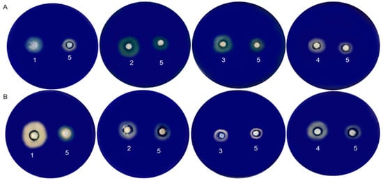 The selected microorganisms were subjected to the detection of extracellular hydrolases (amylase, cellulase, and peptidase). The tests were conducted on agar plates with the enzymatic extracts obtained from each microorganism after growth in its respective culture medium. For the screening of amylase, cellulase, and peptidase detection on agar plates, the microorganisms were cultured in their specific media for 24 h. Subsequently, the cultures were centrifuged at 5000 rpm for 20 min at 4 °C using centrifuge Sorvall ST 16R (Thermo Scientific, Waltham, MA, USA). The resulting supernatants were collected as enzymatic extracts for further analysis, following the method described by Junior et al. []. For amylase detection, the medium consisted of 2 g/L starch, 1 g/L yeast extract, and 8.5 g/L NaCl. For cellulase detection, the medium contained carboxymethylcellulose (CMC) at a concentration of 2 g/L, 1 g/L yeast extract, and 8.5 g/L NaCl. A gelatin medium was prepared with 10 g/L gelatin, 1 g/L yeast extract, and 8.5 g/L NaCl for peptidase detection. All media used for enzymatic screening contained 2.0 g of agar. For the hydrolases assay, 70 µL of the enzymatic extract was added to a 5 mm well made in the agar plate. The plates were then incubated at 30 °C for 48 h to allow the enzymes to act. To visualize the hydrolysis halos caused by amylase and cellulase, a solution of Lugol 2% (containing 0.7% KI and 0.3% I2) was used. A solution of Coomassie blue (0.25% w/v) in a mixture of methanol and acetic acid (5:1:4 v/v/v) was employed for peptidase activity. The plates were subsequently destained using a solution of 50% methanol and 10% acetic acid (v/v). All hydrolase activities were scored as grades: “grade -” when no visible halo was present, “grade +” when the visible halo was less than 2.0 cm, and “grade ++” when the halo zone was equal to or greater than 2.0 cm []. The experiments were performed in triplicate.