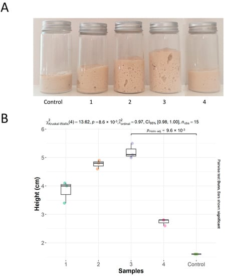 (A) Dough without inoculum (Control); dough with S. boulardii MUCL 43341 (P) (1); dough with S. cerevisiae (S1) (2); dough with S. cerevisiae (S2) (3); dough with K. unispora (S) (4). (B) Boxplot of height (cm) of levain fermentation in tubes. The line represents the only sample (3) that presented height with a statistically significant difference compared to the control (p < 0.05).