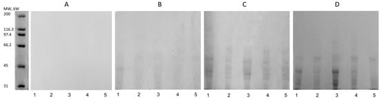 This study investigated the enzymatic activity of the selected microorganisms’ crude extracts concerning gluten biodegradation. The enzymography technique was adopted to detect the enzymatic action on gluten at different incubation times (Figure 6). Gluten proteins are wheat storage proteins with hundreds of components that differ in solubility, structure, molecular weight, and amino acid composition. The enzymatic extracts of all microorganisms showed activity. Figure 6A shows the beginning of the experiment at time 0, where it is possible to observe no hydrolysis and consequent bands because the action of the microorganism’s peptidases did not start effectively. Gluten is a macromolecule that must be hydrolyzed to enter the acrylamide gel. The biodegradation begins slowly, and in 10 min, it is possible to observe subtle bands starting to show (Figure 6B), at 30 min (Figure 6C) and at 2 h (Figure 6D). All extracts showed activity with bands around 30,000 MW, 45,000 MW, and 50,000 MW.