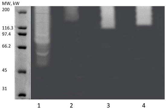 The diversity of MW ranges shows that the byproducts of gluten biodegradation can present very diverse fragments. Figure 6D shows the result of degradation after 2 h of incubation. It can be seen that Lane 3 showed bands and possibly up to ~66.2 kDa, while the other lanes reached a maximum of ~45 kDa. del Amo-Maestro et al. [] used SDS-PAGE analysis to investigate the digestion of gliadin by neprosin. They observed that neprosin efficiently degraded gliadin at concentrations below ~5 μM, generating fragments below the control bands. Thus, the fragments shown in Figure 7 suggest gluten degradation. However, making any statement about the specificity of enzyme action is impossible.