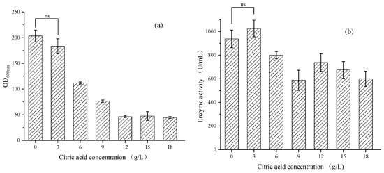 (a) Biomass versus citric acid concentration gradient during 120 h of shaking flask fermentation; (b) Hydrolase activity versus citric acid concentration gradient during 120 h of shaking flask fermentation. The data represent the mean ± standard deviation (n = 3). Statistical analysis was carried out by using the Student’s t test (one-tailed, ns, not significant).