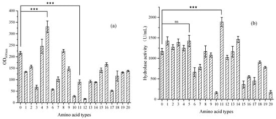 (a) Biomass versus different types of amino acids during 120 h of shaking flask fermentation; (b) Hydrolase activity versus different types of amino acids during 120 h of shaking flask fermentation. The data represent the mean ± standard deviation (n = 3). Statistical analysis was carried out by using the Student’s t test (one-tailed, ns, not significant; *** p < 0.001).