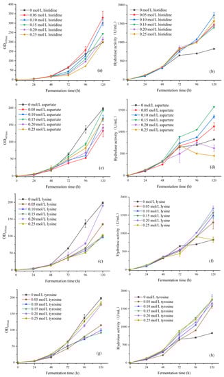 (a) The biomass of histidine concentration gradient during 120 h of shaking flask fermentation; (b) The hydrolytic enzyme activity of histidine concentration gradient during 120 h of shaking flask fermentation; (c) The biomass of aspartic acid concentration gradient during 120 h of shaking flask fermentation; (d) The hydrolytic enzyme activity of aspartic acid concentration gradient during 120 h of shaking flask fermentation; (e) The biomass of lysine concentration gradient during 120 h of shaking flask fermentation; (f) The hydrolytic enzyme activity of lysine concentration gradient during 120 h of shaking flask fermentation; (g) The biomass of tyrosine concentration gradient during 120 h of shaking flask fermentation; (h) The hydrolytic enzyme activity of tyrosine concentration gradient during 120 h of shaking flask fermentation.