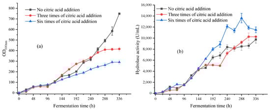 (a) The biomass OD600nm with different citric acid addition times in 336 h fermentation; (b) The hydrolytic enzyme activity with different citric acid addition times in 336 h fermentation.