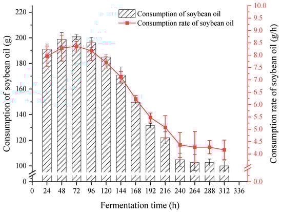 It was hence decided to change the manual feeding mode to automatic feeding mode based on the consumption rate of soybean oil, and taking samples every 24 h for centrifugal testing of soybean oil consumption. Automatic feeding scheme: 0–96 h feeding rate 8.3 g/h; 96–240 h feeding rate 6.25 g/h; 240–312 h feeding rate 4.2 g/h. The experimental results are shown in Figure 6.