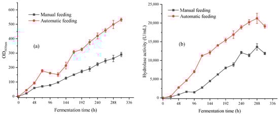 (a) The biomass OD600nm of manual and automatic feeding in 312 h fermentation; (b) The hydrolase activity of manual and automatic feeding in 312 h fermentation.