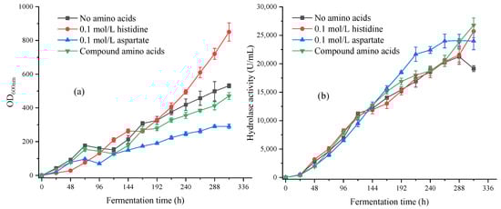 As shown in Figure 7b, the addition of amino acids had a promoting effect on the activity of hydrolytic enzymes. The best-performing group was the composite amino acid group, with a hydrolytic enzyme activity of approximately 26,800 U/mL after 312 h of fermentation, an increase of 32% compared to the control group, and the enzyme activity maintained an upward trend throughout the fermentation process. The 0.1 mol/L histidine group and the composite amino acid group showed the same upward trend in enzyme activity. However, due to the poor fluidity of their fermentation broth, it was difficult to collect and process. The hydrolytic enzyme activity of the 0.1 mol/L aspartic acid group also increased, but after 264 h of fermentation, the enzyme activity tended to stabilize with little room for increase.