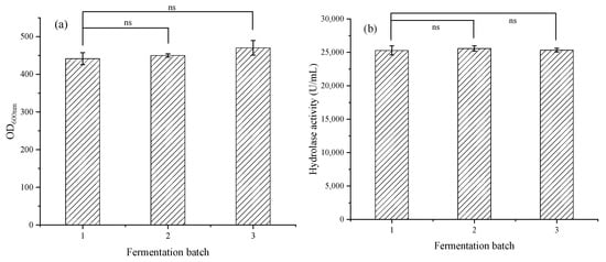(a) The biomass in multibatch stable fermentation for 300 h; (b) The hydrolase activity in multibatch stable fermentation for 300 h. The data represent the mean ± standard deviation (n = 3). Statistical analysis was carried out by using the Student’s t test (two-tailed, ns, not significant).