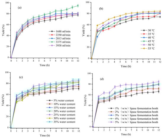 (a) Effect of material flow rate on the yield of free fatty acids. Other reaction conditions: reaction temperature 40 °C, water content 20 wt% and lipase fermentation broth consumption 5 wt%; (b) Effect of reaction temperature on the yield of free fatty acids. Other reaction conditions: material flow rate 2813 mL/min, water content 20 wt% and lipase fermentation broth consumption 5 wt%; (c) Effect of water content on the yield of free fatty acids. Other reaction conditions: material flow rate 2813 mL/min, reaction temperature 45 °C and lipase fermentation broth consumption 5 wt%; (d) Effect of lipase dosage on the yield of free fatty acids. Other reaction conditions: material flow rate 2813 mL/min, reaction temperature 45 °C and water content 25% (w/w).