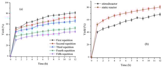 (a) Reuse of lipase fermentation broth. Reaction conditions: material flow rate 2813 mL/min, reaction temperature 45 °C, water content 25 wt% and lipase consumption 3 wt%; (b) Comparison of experimental data on the production of free fatty acids in a self-made static reactor and in a stirred reactor.