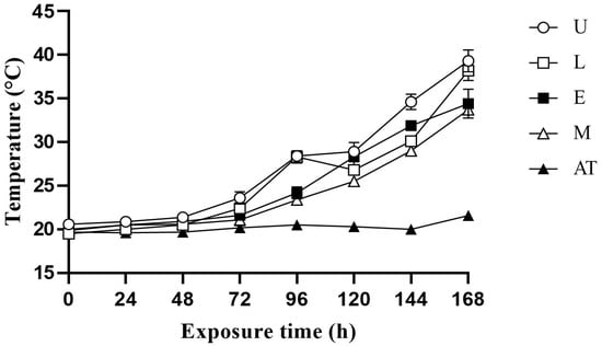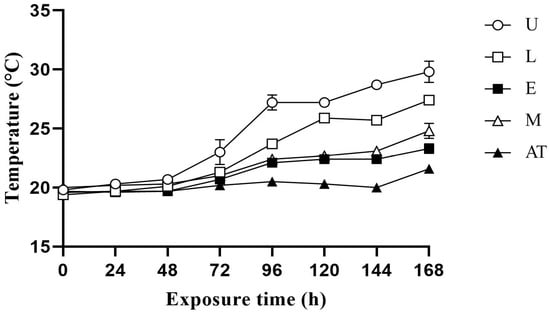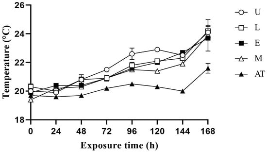 Effect of additive application on the temperature change in amaranth and wheat bran mixed silage after exposure to aerobic conditions at 60% moisture content. U, control; L, lactic acid bacteria; E, cellulase; M, mixture of lactic acid bacteria and cellulase; AT, ambient temperature.