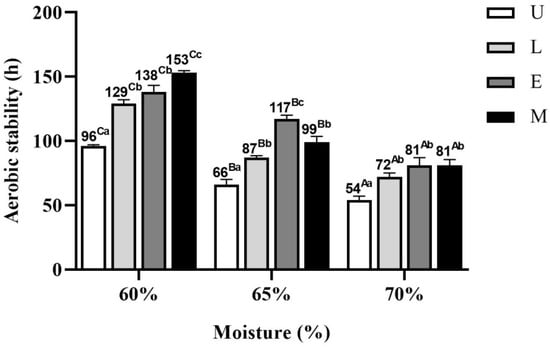 The time required for the AWB mixed silage temperature to exceed room temperature by 2 °C after exposure to air is shown in Figure 4. The aerobic stability of AWB mixed silage gradually decreased with increasing MC (p < 0.05). At 60% MC, the aerobic stability of AWB mixed silage was increased by 33 h, 42 h, and 57 h in the L, E, and M groups, respectively, compared to the control group (p < 0.05). Under 65% MC, the aerobic stability of AWB mixed silage in U, L, E and M groups was 66 h, 87 h, 117 h and 99 h, respectively;compared to the control group, the aerobic stability of AWB mixed silage was 31.8%, 77.3%, and 50% higher in the L, E, and M groups, respectively (p < 0.05). Under 70% MC, the control group had the worst aerobic stability, with 54 h, which was lower than the other treatment groups (p < 0.05); the best were the E and M groups, with 81 h, which were higher than the L and control groups.