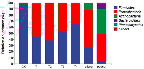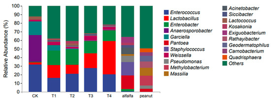 At the phyla classification level (Figure 1), there were differences in the microbial community composition of mixed-silage samples with different proportions of alfalfa and peanut vine. The microorganisms in alfalfa raw materials are mainly Proteobacteria and Firmicutes, while the microorganisms in peanut vine are mainly Proteobacteria and Actinobacteriota. In the CK, T3 and T4 groups, the relative abundances of Firmicutes reached 97.09%, 52.29% and 65.90%, respectively. Therefore, in the CK and T4 groups, Firmicutes were the absolute dominant flora, while the dominant flora in the T3 group were Firmicutes and Proteobacteria. The relative abundances of Proteobacteria in the T1 and T2 groups were 53.74% and 61.41%, respectively, making these the absolute dominant bacteria. The relative indexing of Actinobacteria in the CK, T2, T3 and T4 groups was below 1.00% but reached 1.87% in the T1 group. In addition to the two raw materials, Bacteroidetes were also detected in the T1 group, while Planctomycetes were only detected in peanut stalks.