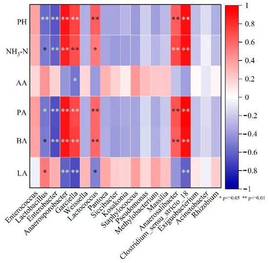 Correlations between silage fermentation quality indicators and microbial communities were analyzed and presented in the form of heat maps (Figure 3). The results showed that Lactobacillus and Enterobacter were significantly negatively correlated with pH, NH3-N, PA and BA content (p < 0.05); Lactobacillus exhibited a significant positive correlation with LA content (p < 0.05).
