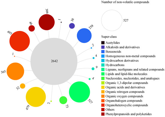 Further grouping of these nVCs resulted in 163 classes, with carboxylic acids and derivatives being the largest class (398 nVCs); followed by organooxygen compounds (364 nVCs); fatty acyls (209 nVCs); prenol lipids (158 nVCs); benzene and substituted derivatives (138 nVCs); flavonoids (91 nVCs); steroids and steroid derivatives (81 nVCs); coumarins and derivatives (66 nVCs); glycerophospholipids (65 nVCs); phenols (63 nVCs); indoles and derivatives (61 nVCs); pyridines and derivatives (52 nVCs); cinnamic acids and derivatives (51 nVCs); benzopyrans (40 nVCs); organonitrogen compounds (32 nVCs); keto acids and derivatives (29 nVCs); imidazopyrimidines (28 nVCs); quinolines and derivatives (27 nVCs); isoflavonoids (26 nVCs); lactones (23 nVCs); naphthalenes (22 nVCs); purine nucleosides (22 nVCs); hydroxy acids and derivatives (21 nVCs); pyrimidine nucleosides (21 nVCs); phenylpropanoic acids (19 nVCs); dihydrofurans (18 nVCs); diazines (18 nVCs); pyrans (17 nVCs); peptidomimetics (16 nVCs); piperidines (13 nVCs); heteroaromatic compounds (12 nVCs); azoles (12 nVCs); macrolides and analogues (11 non-volatile compounds); phenol ethers (11 nVCs); pyrrolidines (11 nVCs); pteridines and derivatives (10 nVCs); and benzodioxoles (10 nVCs); among others.
