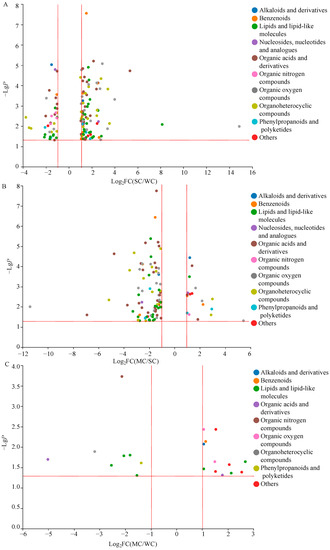 Differentially changed non-volatile compounds (DCnVCs) between natural processing (SC), washed processing (WC), and honey processing (MC), respectively. DCnVCs between SC and WC (A); DCnVCs between MC and SC (B); DCnVCs between MC and WC (C).