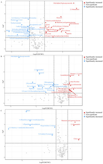 In MC/SC, a total of 103 DCnVCs and 25 DCVCs were detected; 85 nVCs and 16 VCs decreased significantly. Meanwhile, 18 nVCs and 9 VCs increased significantly. The important DCnVCs were 3-fluoro-2-hydroxyquinoline, etimicin, lichenin, and imazamox, and the important DCVCs were ethylalapha-D-glucopyranoside, 2-pyrrolidinone, furfuryl alcohol, and pentane-1,2,5-triol. In MC/WC, 20 DCnVCs and 9 DCVCs were detected; 8 nVCs and 6 VCs decreased significantly, and 12 nVCs and 3 VCs increased significantly. The important DCnVCS were (S)-2-hydroxy-2-phenylacetonitrile O-[b-D-apiosyl-1->2)-b-D-glucoside], CMP-2-aminoethyphosphonate, talipexole, and neoconvallatoxoloside, and the important DCVCS were citric acid, mannonic acid, gamma-lactone, 3-(1-hydroxy-1-methylethyl)benzonitrile, and maltol.