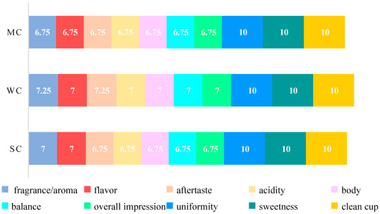 The cupping score of coffee beverages typically falls within the range of 70.00–79.00, thus indicating a premium quality (70.00–79.00) [37]. In this study, the total scores of SC, WC, and MC were 77.75, 79.50, and 77.25, respectively. The sensory evaluation included fragrance/aroma, flavor, aftertaste, acidity, body, balance, and overall impression (Figure 4), with the washed processing method receiving the highest sensory score. The sensory characteristics detected in different coffee samples subjected to different processing methods included flowery, fruity, nutty, and herbal flavors. For instance, flowery, orange fruity, and roasted walnut were described in the natural method coffee. Roasted nut, flowery, and orange were attributed to the washed method coffee, whereas roasted walnut was the dominant flavor in coffee obtained by the honey method.