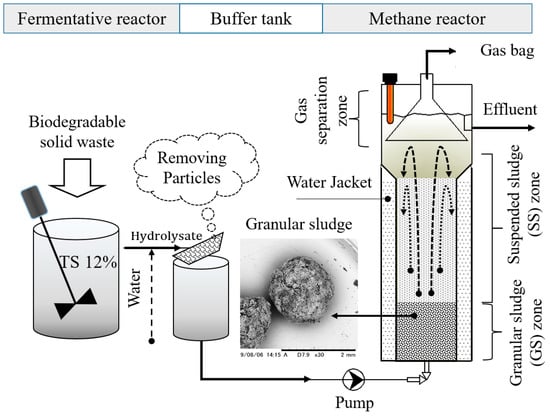 Anaerobic digestion is a sequence of processes, including hydrolysis/acidogenesis, acetogenesis, and methanogenesis [3,4]. Many reports have shown that separating hydrolysis and methanogenesis in two distinct reactors (two-stage anaerobic digestion-TAD) would bring benefits to its performance and flexibility to the operation [3,5,6]. Recently, the application of TAD at the large-scale level has also begun to be commercialized. GICON is a two-stage dry-wet anaerobic digestion process. The technology was developed, tested, and commercialized in Germany by the GICON group. The first industrial-scale plant using this system is the Harvest Energy Garden located in Richmond (Canada), which is also one of the largest high-solid digestion plants in North America. The plant processes approximately 30,000 tons of combined food and yard waste per year and produces approximately 770 kW of electrical energy [7]. Another example is the Eisenmann system, which is based on a two-stage process using continuous plug-flow reactors to deal with high solid waste. The proven Eisenmann systems are expandable with add-on modules, allowing for a wide range of process capacities, from 3000 to over 100,000 tons per year [8]. The main concern in the TAD is the methane reactor (MR), because methane-forming microorganisms have a much slower growth rate and are much more sensitive compared with other groups of microorganisms [3,4]. There are two growth mechanisms in the MR, which are suspended sludge (SS) and attached sludge processes [4,9,10]. In the SS reactor, the microorganisms are maintained in suspension within the liquid. In the other mechanism, they attach and grow on supporting media with the most effective technique called granular sludge (GS). As a result, the second mechanism has a much higher density of microorganisms than the first one [9]. This makes the GS technique have more advantages than the SS, such as the fact that it is not washed away by water flow, is resistant to toxins, and has high concentrations of microorganisms [11]. Nevertheless, the current application of the GS technique requires a high-speed flow (through a circulating flow) to maintain good contact between the GS and the substrate [9,11,12]. As a result, the operation might consume much more energy than the suspended growth one does. These technologies have been widely used in wastewater treatment. However, the GS technique to process BMSW has been limited in the literature.