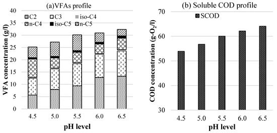 The current study showed a strong positive linear correlation between the concentrations of hydrolyzed matter (SCOD) and pH levels. The SCOD concentration obtained at pH 4.5 was 54 g/L (equivalent to 0.66 g-SCOD/g-VS). This value was 19% lower than that obtained in the pH 6.5 condition. However, the difference between the SCOD levels obtained at pH 6.5 and 6.0 was only 3%. Thus, this study agrees with the results concluded by Yu and Fang [26], Sanders [19], and Van et al. [3] that pH in the range of 6.0–6.5 is the best condition for fermentation. This could be explained by the fact that in a low acidic condition, the VFAs produced exist mainly in the form of undissociated molecules that can pass through the cell membrane, causing an imbalance in energy production in the cell and inhibiting the fermentative activity of microorganisms [27,28].