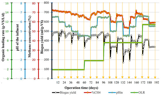 After fermentation, changing the dilution rate (n) and HRT led to a variation in substrate concentration (CODin) and OLR. In addition, fermentation was carried out at different pH levels. Thus, these brought a complex matrix of parameters to a methane reactor operation. The changes caused significant variations in the methanogenesis process. In the end, the results revealed a biogas yield ranging from 193.3 to 327.0 Nml/g-TS (containing 54–72% CH4). The evolution of the influence of operating parameters on the quality and quantity of biogas over time is illustrated in Figure 3.