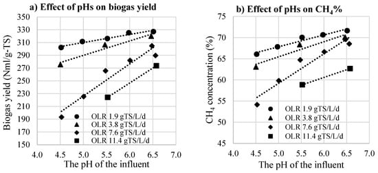 The relationship between biogas production and the pH of the influent at different OLRs is described closely in Figure 4. They had strong positive linear correlations. The slope of these lines rising with the increase in OLR indicated that the influence of pH on biogas production was getting stronger at higher OLRs. At the stage having the lowest OLR (1.9 g-TS·L−1·d−1), the biogas yield increased linearly from 302 Nml/g-TS (66%) CH4) to 327 Nml/g-TS (72%), following pH conditions from 4.5 to 6.5. At an OLR of 3.8 g-TS·L−1·d−1, there seemed to be a breakpoint at the pH 5.5 position (the slope in the range of pH 4.5–5.5 was higher than that in pH 5.5–6.5). This phenomenon was clearer at higher OLR. As we can see, pH 5.5 seemed to be a critical point where the efficiency of MR was significantly inhibited when working with the influent pH below this value.
