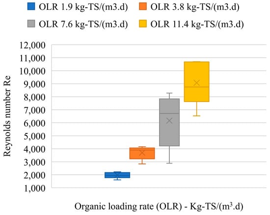 The GS particles have a much higher density (d = 1.5–2.0 mm, 1010–1050 g/L) than water (998 g/L), so they could easily settle to the bottom under operating conditions with a very low velocity (RT of 3–5 d). Meanwhile, very fine sludge created a suspended state in the fluidized zone due to the drag force of the biogas bubbles. The calculation results of the Reynolds number at different OLRs in the fluidized zone of MR are shown in Figure 5. The higher the OLRs the reactor operated at, the greater the Reynolds number was, which indicated a higher activity level in the fluidized zone. Many studies have agreed that flow was laminar at Re < 2300, transitional at Re between 2100 and 4000, and turbulent at Re > 4000 [12,33]. Accordingly, the flow mode in the reactor was laminar flow at an OLR of 1.9 kg-TS.m−3·d−1 and transition flow at an OLR of 3.8 kg-TS.m−3·d−1. The reactor started to show turbulent mode at OLR above 3.8 kg-TS.m−3·d−1. Thus, through the Re values, the fluidized zone formation hypothesis in Section 2.3 was completely proven at high OLRs. However, excessive turbulence in the reactor could lead to the washing-out of SS in the fluidized zone of the reactor [12]. That might cause a reduction in treatment efficiency, as occurred at an OLR of 11.4 kg-TS·m−3·d−1 in this study.