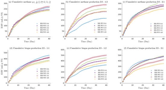 Figure 1 shows the similarity in biogas generation at 40 days of digestion (Figure 1a,b) when the I:S rate is 1:2 and 2:1. Note that the order in which the substrate and co-substrate rate generate biogas is RR:WS (3:1, 2:2, 1:3, 4:0 and 0:4) for both proportions. There is an inversely proportional relationship of substrate and co-substrate (RR:WS), higher RR and lower WS, the greater the biogas generated implying that RR is easily biodegraded. It is well known that rumen has high cellulose-degrading efficiency thus its bacteria may be involved the AD degradation process. Methanogens active in the rumen may contribute to methanogenesis in the biogas production process [28]. Indeed, it can be observed that biodegradation starts immediately. When the amount of inoculum used is 2 times the amount of substrate (I:S—2:1), it can be observed that during RR and WS co-digestion, the biogas generated improves as the RR fraction added to the digester increases up to 50% with respect to WS, Figure 1c whereas RR to WS at 2:2 rate biogas yield was 493.247 mL/g-VS, being higher than RR (421.726 mL/g-VS) and WS (477.754 mL/g-VS) in monodigestion. Something similar occurs with the experiment I:S—1:1, Figure 1a RR to WS at 3:1 rate biogas yield was 427.787 mL/g-VS, slightly lower than WS (460.891 mL/g-VS) and higher than RR (365.335 mL/g-VS) in monodigestion. When the inoculum to substrate rate was 1:2, Figure 1b, the highest biogas production occurred. Additionally, RR to WS at 3:1 rate, biogas yield was 502.903 mL/g-VS, higher than RR (375.441 mL/g-VS) and WS (329.639 mL/g-VS) in monodigestion. As the amount of inoculum decreases in the digesters with respect to the substrate, the cumulative biogas yield (CBY) decreases for the RR:WS treatments at 0:4 to 2:2 rates. However, RR to WS at 3:1 and 4:0 rates, the amount of accumulated biogas increases from 421.726 mL/g-VS to 502.903 mL/g-VS, the same occurs with 4:0 rate indicating that adding a low percentage of inoculum and high percentage RR benefits biogas production.
