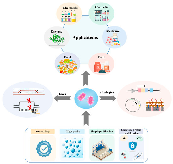 C. glutamicum is a Gram-positive microorganism with a genome GC content of 53.8%. It exhibits tolerance to various inhibitors, has high environmental adaptability, fast metabolism and growth rates, and has been deemed safe by the US FDA [1,2]. After Kinoshita et al. discovered in the 1950s that C. glutamicum could produce glutamic acid, it became a major production strain for various amino acids in the global fermentation industry [3,4]. This has also stimulated numerous researchers to explore the biosynthesis of amino acids and their derivatives in C. glutamicum. Since then, research on the production of various amino acids has thrived, resulting in significant increases in yields and dramatic cost reductions. Therefore, it is even more crucial to develop industrially high-yielding strains [5,6]. With the continuous advancement of science and technology, gene editing techniques are being progressively developed and applied to precisely engineer C. glutamicum. Currently, engineered C. glutamicum is increasingly utilized for producing various chemical substances, such as parabens, natural plant products such as eriodictyol, recombinant proteins, industrial enzymes including maltooligosyltrehalose synthase, biofuels, and biochemicals that comprise nutritional products such as organic acids and functional sugars. Its applications are widespread across industries, including chemicals, food, medical, cosmetics industry, and animal feed, as shown in Figure 1 [7,8,9,10,11]. C. glutamicum has emerged as a favored host for industrial-scale production.