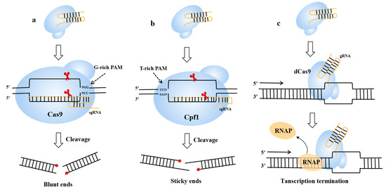 CRISPR- Cas9/Cpf1, CRISPRi gene editing characteristics. (a) Cas9 protein shears to form blunt ends; (b) Cpf1 protein shears to form sticky ends; (c) the dCas9/gRNA complex binds to target genes to suppress gene expression. RNAP: RNA polymerase.
