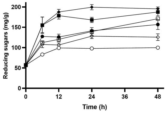 | Reducing sugars released (mg/g) | 67 ± 6 a | 64 ± 1 a | 58 ± 1 a |