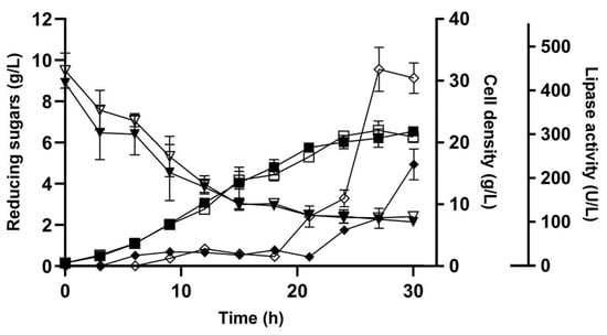 | Maximum lipase production (U/g) | 56 ± 9 a,b | 63 ± 4 b | 54 ± 2 a |