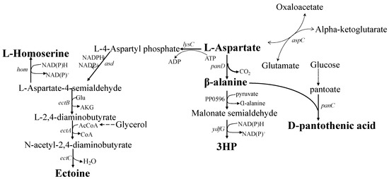 Pathways for producing L-aspartate derivatives with L-aspartate as the substrate. lysC, aspartokinase; asd, aspartate-semialdehyde dehydrogenase; hom, L-homoserine dehydrogenase; ectB, L-2,4-diaminobutyrate transaminase; ectA, 2,4-diaminobutyrate acetyltransferase; ectC, ectoine synthase; panD, aspartate decarboxylase; PP0596, β-alanine-pyruvate transaminase; ydfG, 3-hydroxyacid dehydrogenase; panC, pantothenate synthetase; aspC, aspartate transaminase.