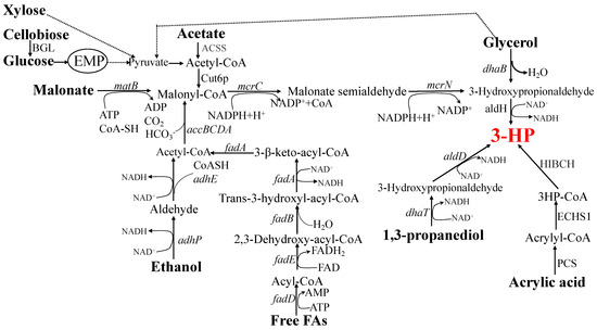 Biosynthetic pathways of 3-HP. The substrate used for 3-HP biosynthesis is marked in bold. dhaB, glycerol dehydratase; aldH, aldehyde dehydrogenase; matB, malonyl-CoA synthetase; mcrC, malonyl-CoA reductase C-domain; mcrN, malonyl-CoA reductase N-domain; fadD, fatty acyl-CoA synthetase; fadE, acyl-CoA dehydrogenase; fadB, α component of the fatty acid oxidation complex; fadA, β component of the fatty acid oxidation complex; accBCDA, acetyl-CoA carboxyltransferase complex; adhP, alcohol dehydrogenase; adhE, alcohol/aldehyde dehydrogenase; ACSS, acetyl-CoA synthetase; Cut6p, acetyl-CoA/biotin carboxylase; BGL, beta-glucosidase; dhaT, alcohol dehydrogenase; aldD, aldehyde dehydrogenase; PCS, acrylyl-CoA (propionyl-CoA) synthetase; ECHS1, enoyl-CoA hydratase, HIBCH, 3-hydroxyisobutyryl-CoA hydrolase.