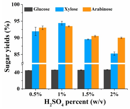 Changes in yields of glucose, xylose, and arabinose with different dilute sulfuric acid concentrations under the pretreatment conditions of 115 °C and 120 min. The error bars represent the standard deviation of triplicates.