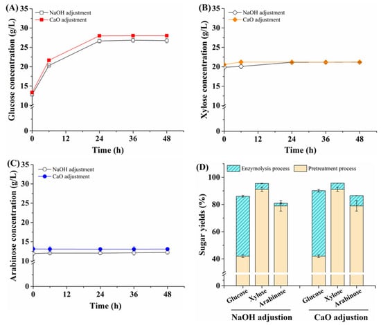 Effect on the concentrations (A–C) and yields (D) of glucose, xylose, and arabinose using NaOH or CaO as a pH regulator for the pretreated corn fiber during enzymatic hydrolysis. The error bars represent the standard deviation of triplicates.