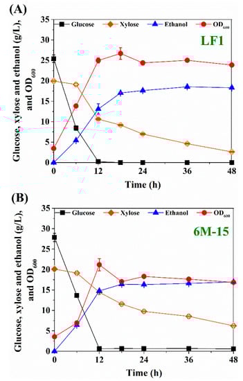 Ethanol production from corn fiber hydrolysate by strain LF1 (A) or 6M-15 (B). The corn fiber hydrolysate was prepared through the pretreatment at 0.5% H2SO4, 115 °C, and 120 min, and the enzymatic hydrolysis with Sino cellulase at 10% solid loading. The strains were cultivated in oxygen-limited serum bottles with an initial OD600 of 3.5 at 200 rpm, 30 °C. The error bars represent the standard deviation of biological triplicates.