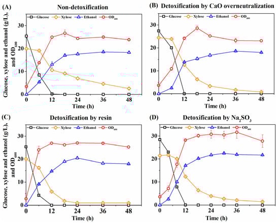 Evaluation of the effects on fermentation of corn fiber hydrolysate with different detoxification methods. (A) Non-detoxification (control); (B) detoxification by CaO over-neutralization; (C) detoxification by resin; (D) detoxification by adding Na2SO3 at 12 h. The strains were cultivated in oxygen-limited serum bottles with an initial OD600 of 3.5 at 200 rpm, 30 °C. The error bars represent the standard deviation of biological triplicates. The statistical significances of the difference on specific consumption of total glucose and xylose between non-detoxification and detoxification (p < 0.05).