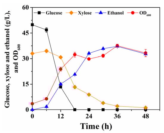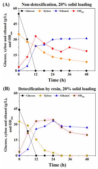 Although the detoxification treatments, such as water washing, overliming, resin adsorption, and biodetoxification, could obviously improve fermentation efficiency, these processes usually result in sugar loss and a long production period which will influence the economy of industrial manufacture. Recently, Guo et al. reported a detoxification-free process for enhancing ethanol production from corn fiber using semi-simultaneous saccharification and fermentation, and the final ethanol concentration reached 40.14 g/L in shake-flask fermentation, representing approximately 81% of the theoretical yield []. However, the total fermentation time was long (144 h), and the xylose utilization rate was still low. In this study, the fermentation ended at 30 h, and the total (glucose and xylose) sugar consumption rate reached 2.56 g/L/h (Figure 5B). Therefore, whether to adopt a detoxification process may be considered according to overall cost accounting during the industrial production of cellulosic ethanol.