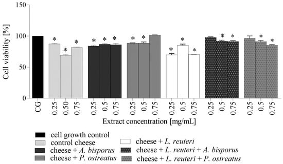 Viability of HCT116 cells treated with extracts of cheeses with and without L. reuteri and mushrooms powders. The asterisk indicates a significant difference of means between samples and cell growth control (CG) according to Dunnett’s test (p < 0.05).