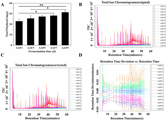 Analysis of polyphenol changes in the acetic acid fermentation (AAF) of Shanxi aged vinegar (SAV). (A): Change in the polyphenol contents during AAF; (B–D): gas chromatography–mass spectroscopy total ion diagram during the AAF of SAV; * p < 0.05; ** p < 0.01. TIC, total ion chromatograms.